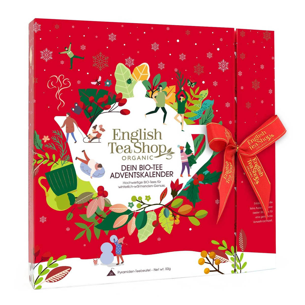 Darčekový adventný kalendár ako kniha, plný pyramídových čajov v bio kvalite. Všetky príchute čajov sú ladené vianočne.