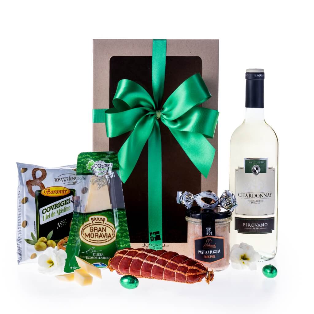 Krásny, premyslený box, ktorým urobíte radosť takmer každému. Výborne pitné biele víno, k tomu na farmárskych trhoch vyhlásená pikantná klobáska od českého výrobcu, najobľúbenejší syr a jemná paštéta. Gurmánske hody môžu začať!