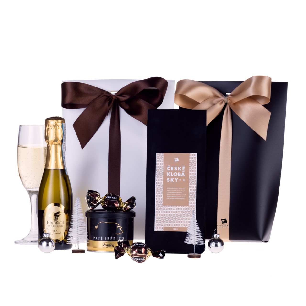 Malý darček ako poďakovanie, ako vianočné prianie. Fľaštička úžasného Prosecca, mäsové delikatesy v podobe španielskej paštétky a lahodných českých miniklobások a na záver malá sladká bodka. Ľahko prenosné, napr. v taške či kabelke. Farbu balenia nám napíšte do poznámky.