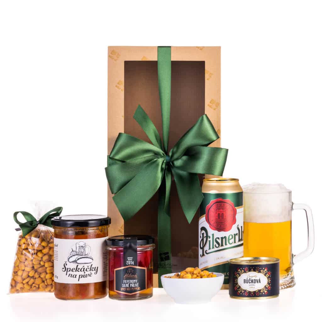 Zlatý mok v podobe plzenskej klasiky je české pivo, ktoré milujú ako muži, tak ženy. Darčekový box dopĺňajú aj špekáčiky na pive, výborná paštéta z bôčika alebo jemne pikantná kukurica v barbecue cestíčku. Pôsobivý darček, ktorý nadchne každého pivomilca.