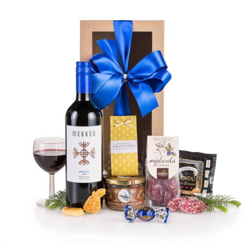 Elegantný darčekový box, obsahujúci vyjimočné chilské červené víno Merkén – Merlot, vynikajúce rillettes z bažantieho mäsa a dalšie pochutky.