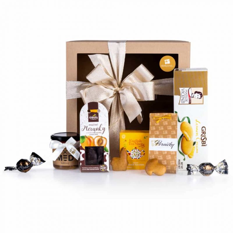 Čo je malé, to je pekné a môže byť také sladké! Kto by odolal malému sladkému potešeniu v krásnom zabalenom boxe, ladenom do zlato-žltých a hnedých farieb. Skvelý darček pre každého, kto rád maškrtí sladké 🙂
