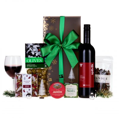 Tento darčekový kôš obsahuje čerstvé potraviny (klobásky, syry atď.).