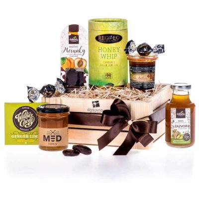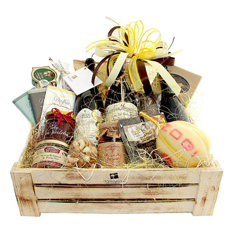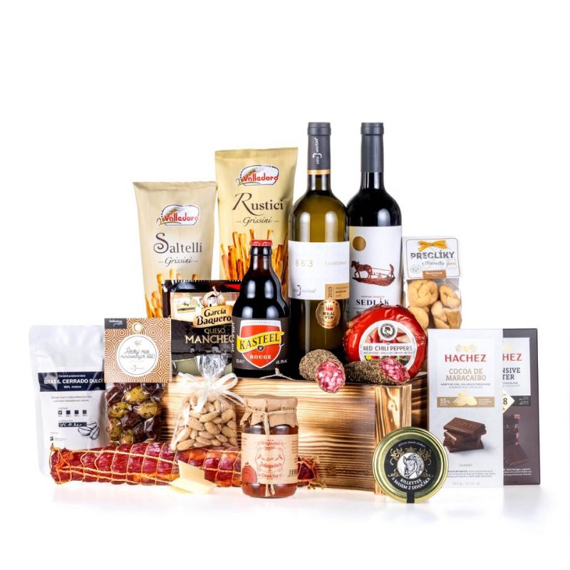 Tento darčekový kôš obsahuje kvalitné čerstvé potraviny (klobásky, syry atď.).