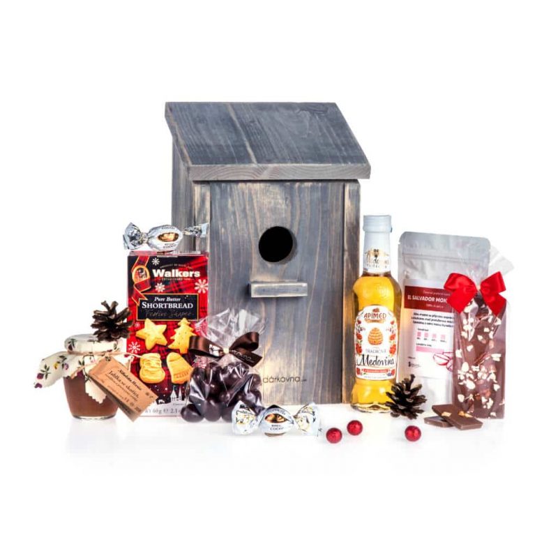 Buďte originálni! Darujte vtipný a pritom užitočný darček, z ktorého budú mať radosť všetci členovia rodiny. Vtáčia búdka je vyrobená z masívneho dreva a má odnímateľnú striešku. Dovnútra sme darčekovo zabalili samé vianočné pochúťky, ktoré výborne chutia. Tento darček musí prekvapiť a potešiť každého.