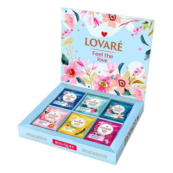 Lovaré Bouquet je krásna darčeková kolekcia vybraných čajov Lovaré, ktorá poteší vašich blízkych. Starostlivo vybrané príchute v krásnej darčekovej krabičke sú najvhodnejším darčekom.