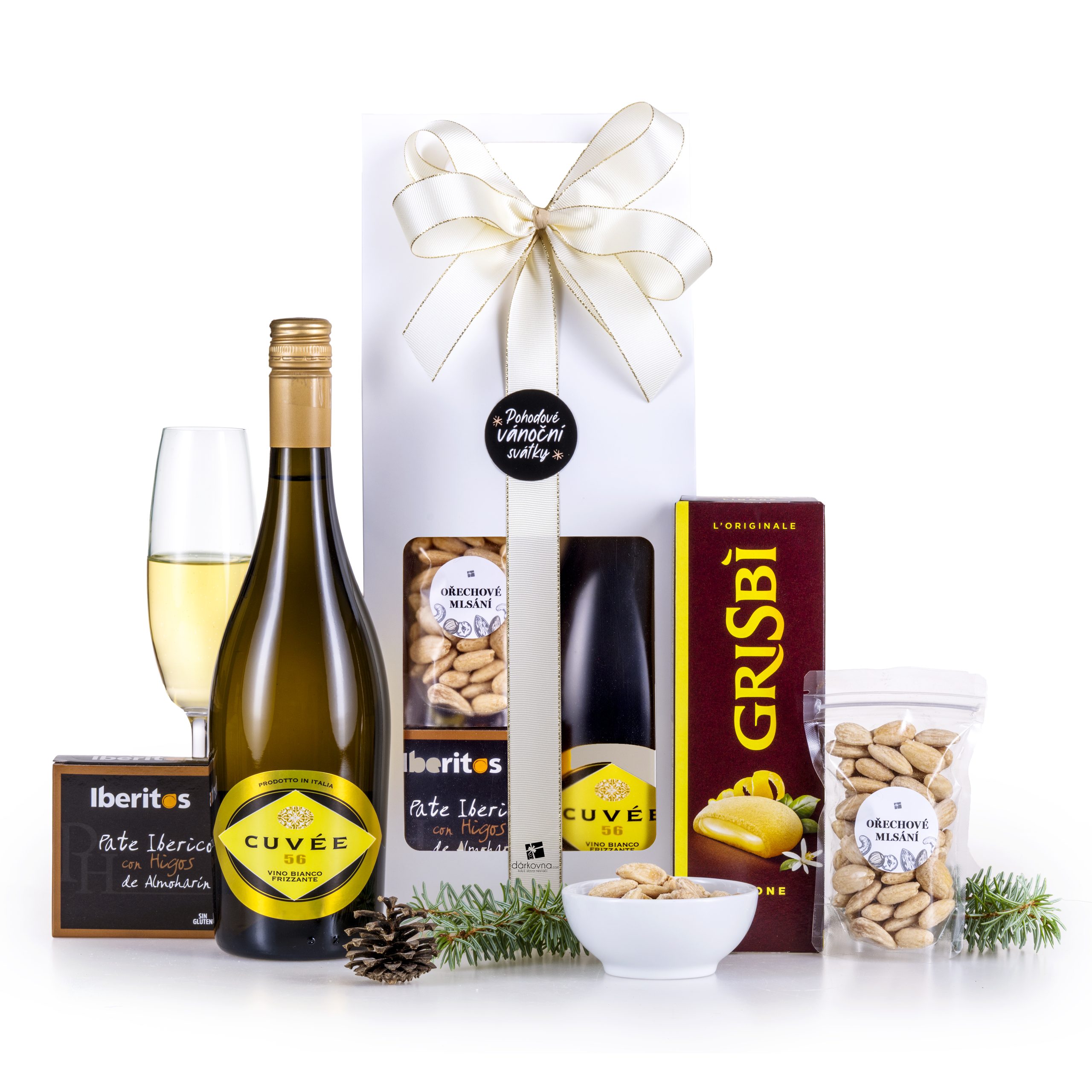 Vianočný darčekový kôš v novom odnosnom balení. Novinka tohtoročných Vianoc. Šumivé lahodné víno doplnené o hriešnu kombináciu slaných a sladkých delikates. Darček, ktorý bude pre obdarovaného vyváženou kombináciou dobrôt a skvelým darčekom.