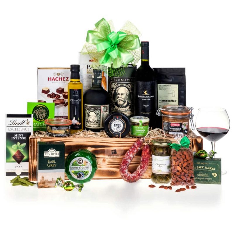 Tento darčekový kôš obsahuje kvalitné čerstvé potraviny (klobásky, syry atď.).