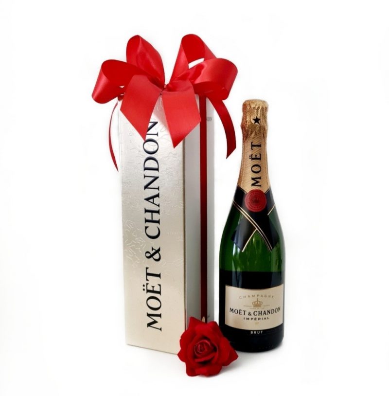 Moët & Chandon v dárkové krabičce, převázaný rudou mašlí.