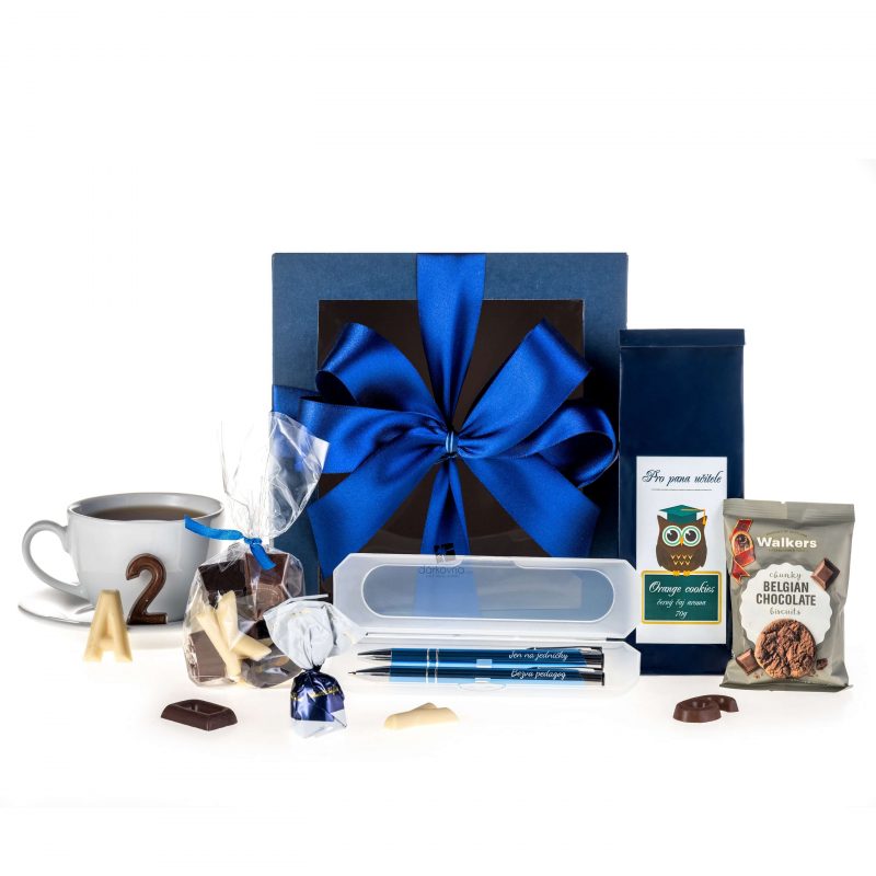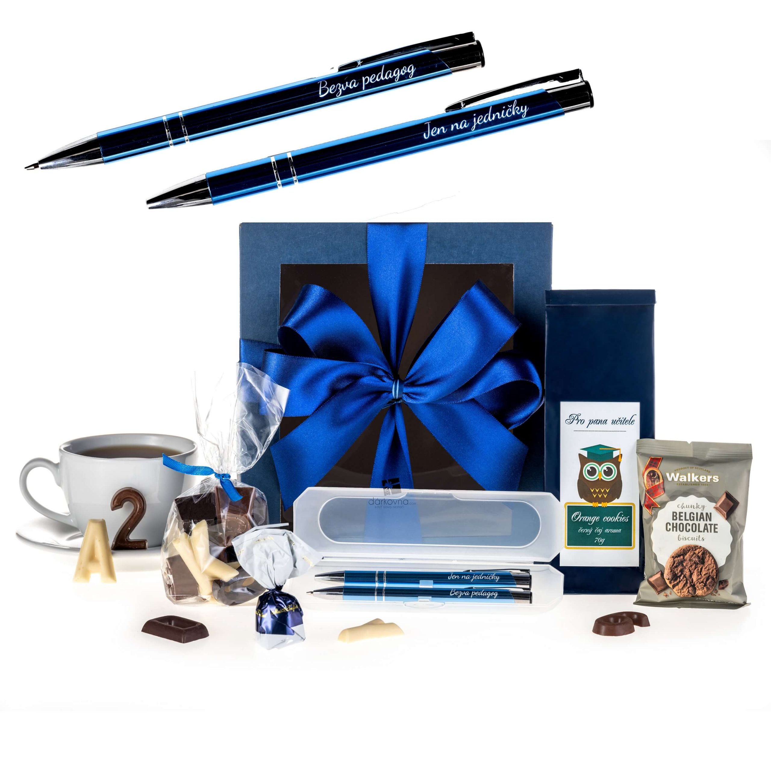 Originálny darček ako poďakovanie pre pána učiteľa. Darčekový box so súpravou pera a ceruzky s gravírovanými textami, ktoré pána učiteľa potešia aj pobavia zároveň. Zostane mu krásna a praktická spomienka. Poriadny relax si vychutná s dúškom skvelého čaju a na nervy poslúži belgická čokoláda v tvare písmeniek a číslic, alebo krehké škótske sušienky.