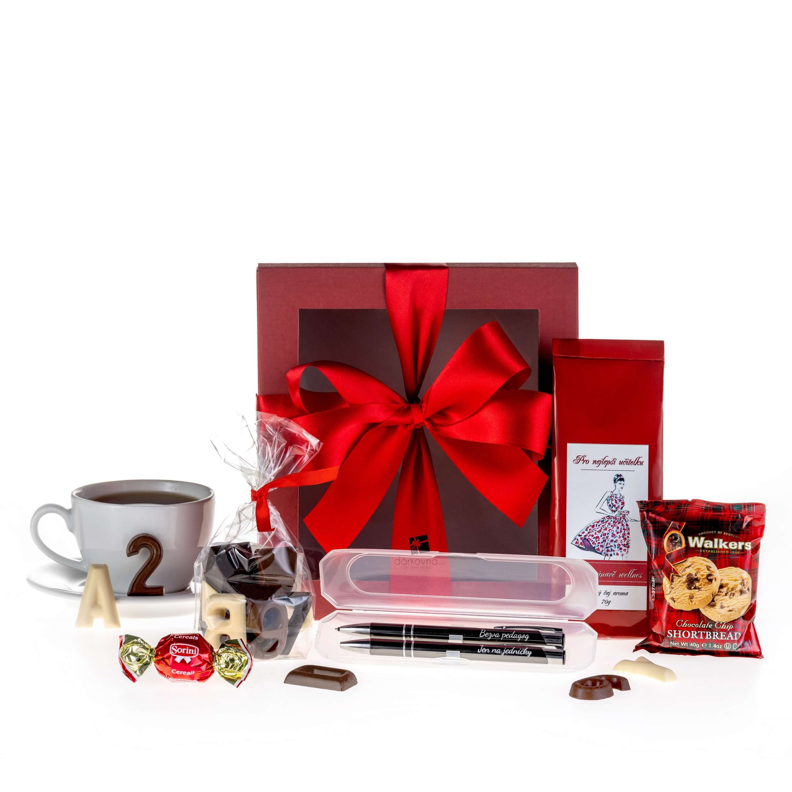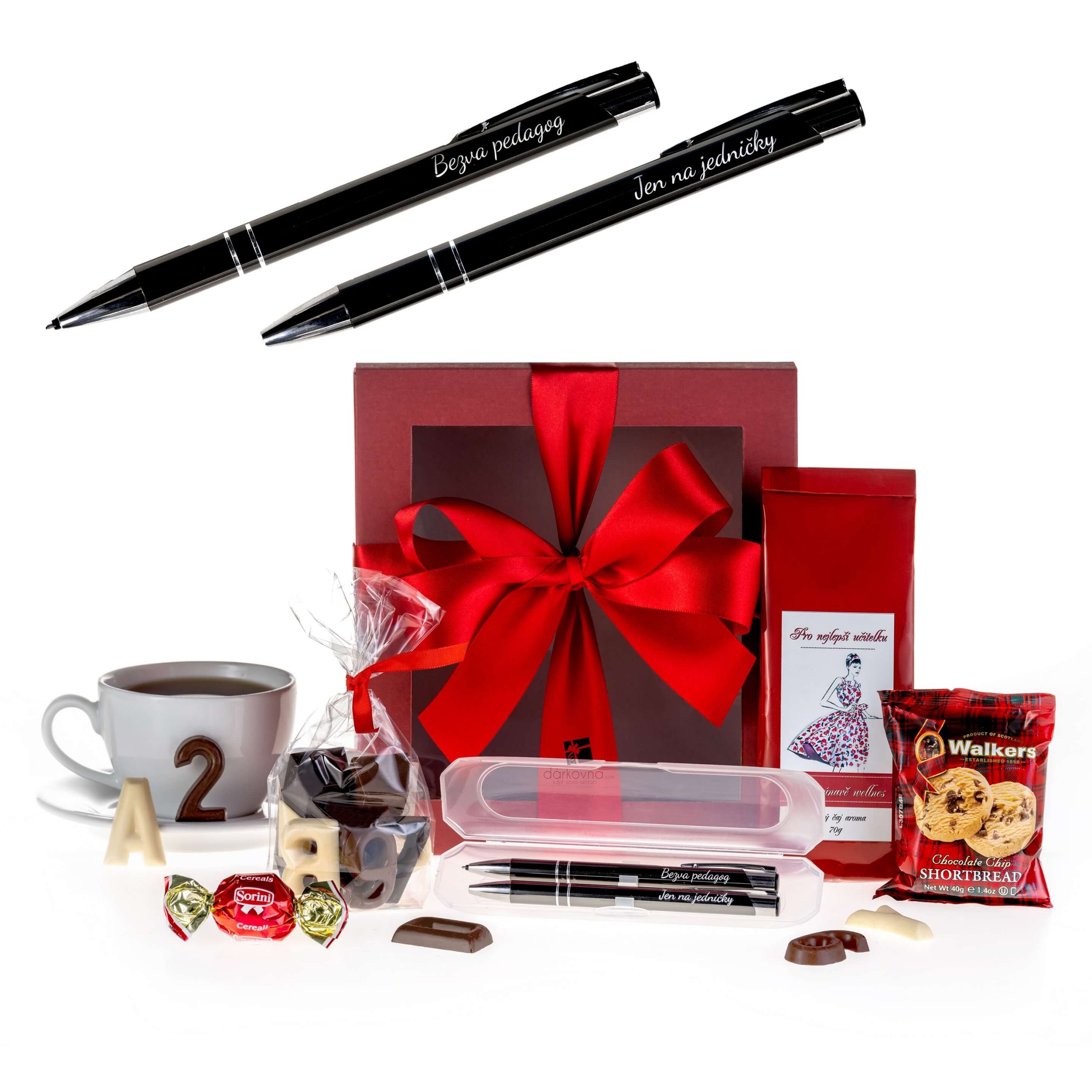 Originálny darček ako poďakovanie pre pani učiteľku. Darčekový box so súpravou pera a ceruzky s gravírovanými textami, ktoré pani učiteľku potešia aj pobavia zároveň. Zostane jej krásna a praktická spomienka. Poriadny relax si vychutná s dúškom skvelého čaju a na nervy poslúži belgická čokoláda v tvare písmeniek a číslic, alebo krehké škótske sušienky.