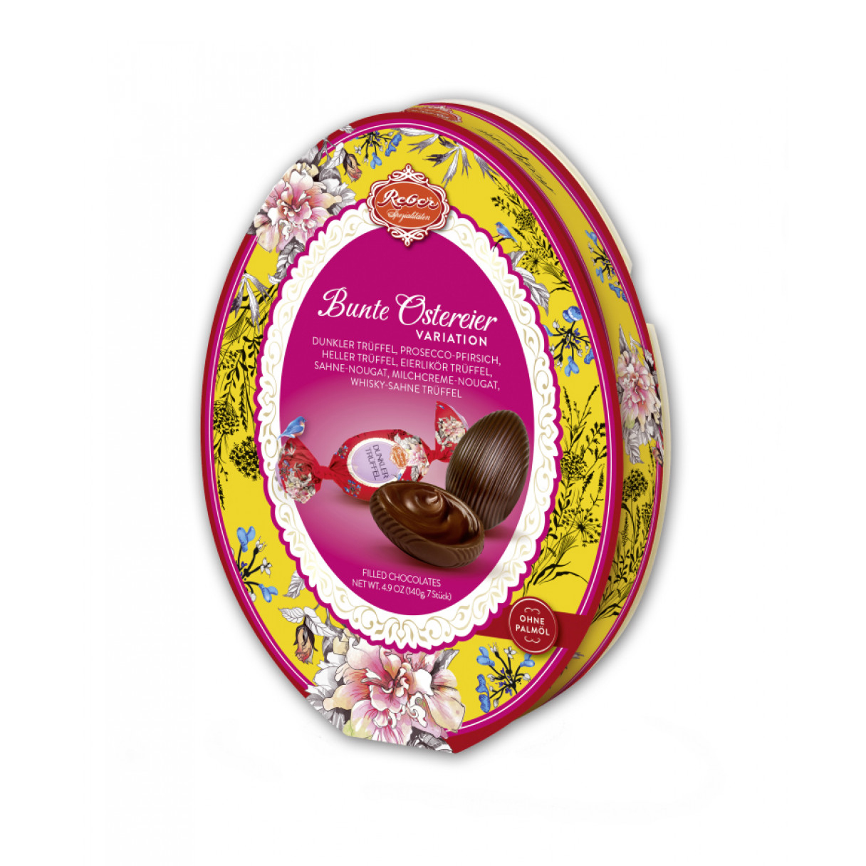 Darčeková sada vajíčok Reber v horkej čokoláde plnená nugátom v rôznych variantoch. V špičkovej kvalite. Balenie je v krásnych farbách.140g