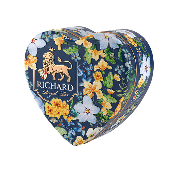 Sypaný čaj v plechovke. Čierny čaj, pomarančová kôra, bergamotová a vanilková príchuť, slnečnicové kvety. Richard Royal Heart – krásna plechovka v tvare srdiečka je darček, ktorý vás urobí šťastnými!