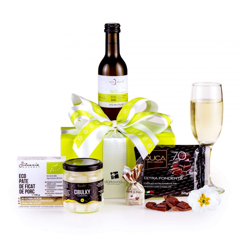 Roztomilé malé balenie s bielym vínom a dobrotami. Potešte blízku osobu a doprajte jej šťastný okamih.