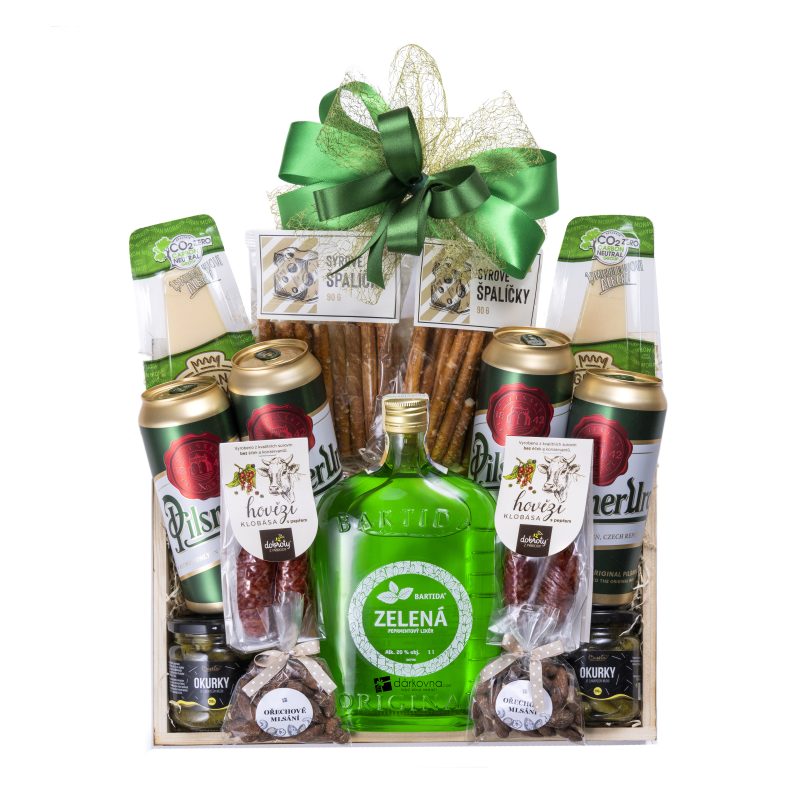 Tento darčekový kôš obsahuje kvalitné čerstvé potraviny (klobásky, syry atď.).